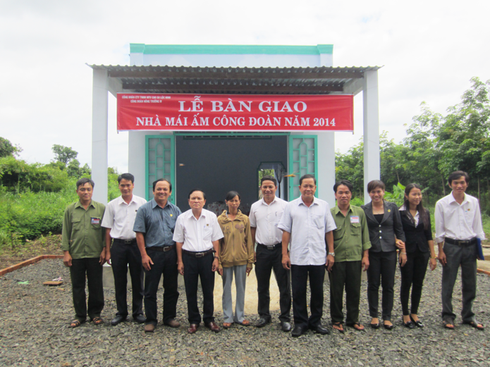 Nhằm thực hiện hiệu quả qui chế sử dụng quỹ “ Mái ấm công đoàn”, thiết thực chào mừng kỷ niệm 85 năm ngày truyền thống ngành cao su Việt Nam, ngày 16/09/2014 Công đoàn cơ sở Nông trường IV đã tổ chức lễ bàn giao nhà “Mái ấm công đoàn” cho công nhân Nguyễn Thị Hòa, thuộc Tổ 1 – Đội 3 – Nông trường IV. Với thời gian 13 năm công tác là công nhân cạo mủ chị Hòa đã 11 năm liền là chiến sĩ thi đua, được Thủ tướng chính phủ, Bộ nông nghiệp và phát triển nông thôn tặng bằng khen. Tuy nhiên, đã nhiều năm công tác nhưng hiện nay chị Hòa vẫn còn khó khăn về nhà ở, vì thế chị Hòa đã được Ban chấp hành Công đoàn các cấp thống nhất và xét hỗ trợ cho chị Hòa xây dựng nhà “ Mái ấm công đoàn” năm 2014. Tổng kinh phí xây dựng là 80 triệu đồng, trong đó 30 triệu đồng được trích từ nguồn quỹ “ Mái ấm công đoàn” của Công đoàn cơ sở Nông trường IV.