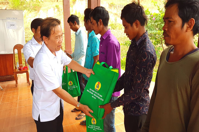Đồng chí Phú Hoàng Minh – Chủ tịch CĐCS Công ty VKETI trao quà cho CNLĐ tại Lộc Ninh – VKETI