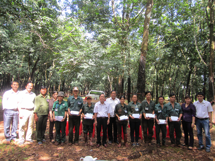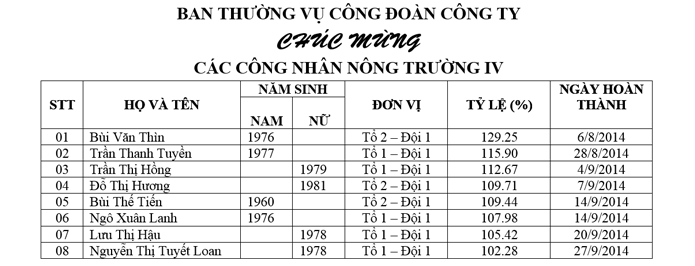 Thực hiện công văn liên tịch số 1021/LT/CSLN-CĐ ngày 22/9/2014 của Tổng giám đốc và Chủ tịch công đoàn Công ty về việc phát động phong trào thi đua nước rút về trước kế hoạch sản lượng 03 tháng cuối năm 2014. Ngày 02/10/2014 đồng chí Trần Thanh Tùng – Chủ tịch công đoàn đại diện Ban thường vụ Công đoàn công ty đã tổ chức khen thưởng đột xuất tại vườn cây cho các công nhân Nông trường IV và Nông trường VI đã hoàn thành trước kế hoạch sản lượng trong tháng 9 ( về trước 03 tháng), cùng sự tham dự đầy đủ Ban lãnh đạo Nông trường, Ban chỉ huy Đội và 17 công nhân của 02 đơn vị.