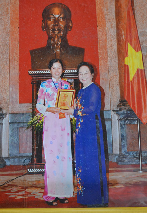 Chị Hà vinh dự được chụp ảnh lưu niệm với Phó Chủ tịch nước Nguyễn Thị Doan