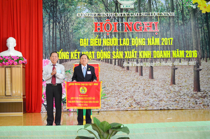 Ông Võ Việt Ngân - Phó CTCĐ Cao su Việt Nam tặng Cờ thi đua xuất sắc toàn diện cho Công đoàn công ty.