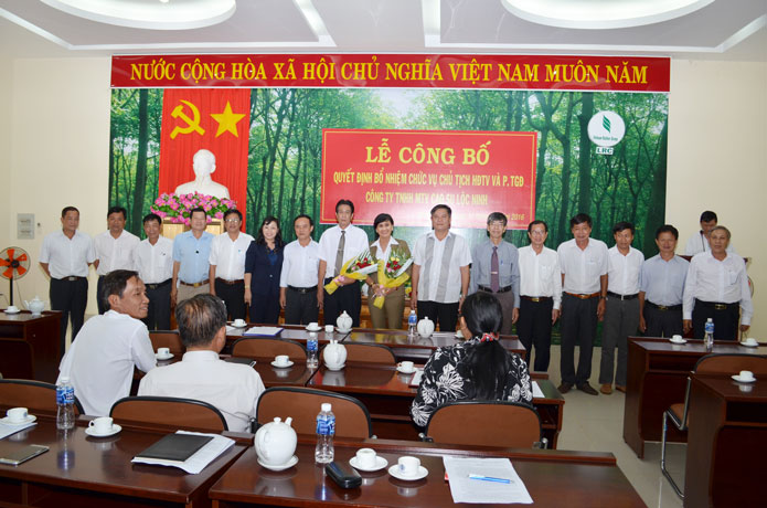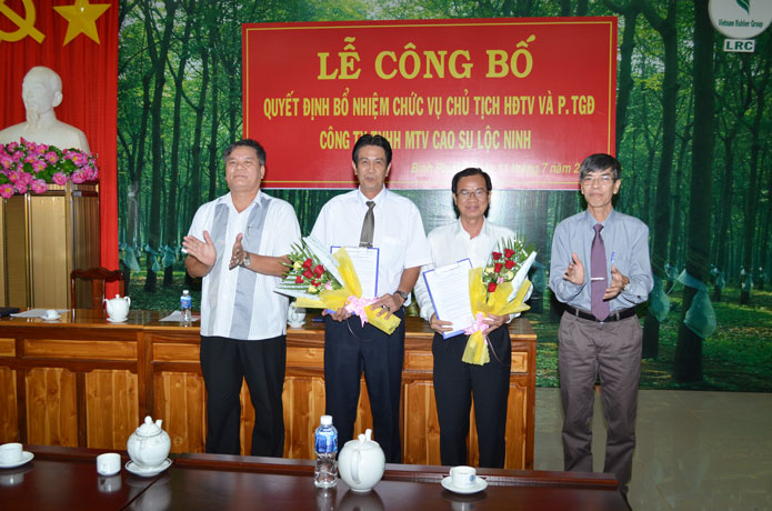 Chiều 11/7/2016, ông Võ Sỹ Lực - Chủ tịch HĐTV Tập đoàn Công nghiệp Cao su Việt Nam (VRG) và ông Nguyễn Đức Tín - Tổng giám đốc Công ty TNHH MTV Cao su Lộc Ninh đã trao quyết định bổ nhiệm hai chức danh lãnh đạo mới tại Công ty.