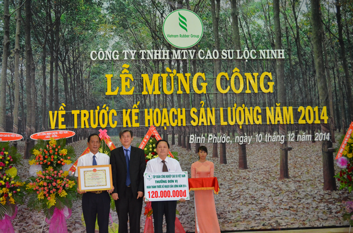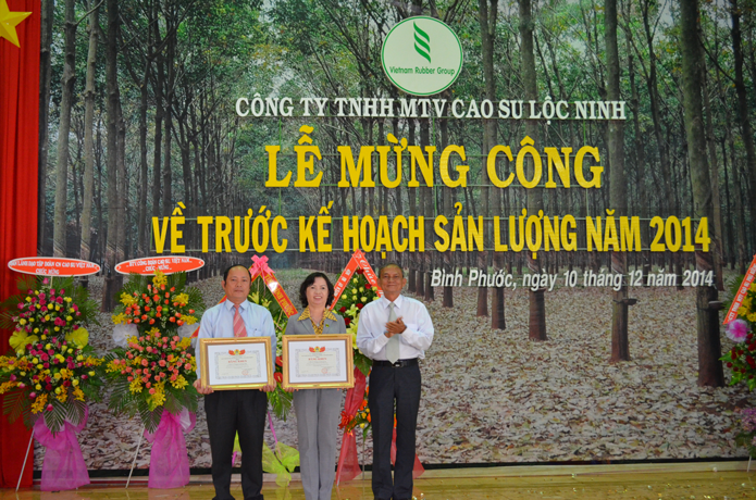 Phát biểu tại buổi lễ, Phó TGĐ Tập đoàn Đ/c Hứa Ngọc Hiệp chúc mừng và đánh giá cao thành quả đạt được của Công ty TNHH MTV cao su Lộc Ninh trong năm 2014. Đ/c Phó Tổng Giám đốc Tập đoàn nhấn mạnh “Đây là đơn vị trong Top đầu về trước kế hoạch cũng là tiền đề giúp cho Tập đoàn sớm hoàn thành các chỉ tiêu sản xuất kinh doanh”