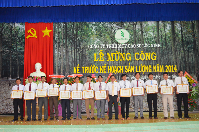 Để biểu dương thành tích đã đạt được, Đ/c Hứa Ngọc Hiệp thay mặt lãnh đạo Tập đoàn trao tặng bằng khen kèm theo tiền thưởng 120 triệu đồng cho công ty. Cùng những thành tích này,Tập đoàn có quyết định khen thưởng cho 96 tập thể trong đó có 06 NT, 24 Đội và 66 Tổ đạt thành tích xuất sắc, hoàn thành kế hoạch khai thác mủ cao su năm 2014. Tổng số tiền thưởng là 480 triệu đồng.