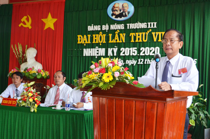 Phát biểu tại đại hội, đồng chí Nguyễn Đức Tín - Bí thư Đảng ủy Công ty đã ghi nhận và biểu dương những kết quả mà Đảng bộ, cán bộ, CNV-LĐ Nông trường III đã đạt được trong 5 năm qua trên các lĩnh vực sản xuất, văn hóa, xã hội, QPAN. Đồng chí đề nghị Đảng bộ Nông trường cần nghiêm túc nhìn nhận những hạn chế, tồn tại, phân tích, làm rõ những nguyên nhân hạn chế, yếu kém của nhiệm kỳ qua, để xác định đúng đắn phương hướng và giải pháp khắc phục thực sự có hiệu quả cao trong nhiệm kỳ tới. Lựa chọn cấp ủy khóa mới đảm bảo chất lượng, số lượng, cơ cấu hợp lý, có tính kế thừa và phát triển; làm tốt công tác bầu Đoàn đại biểu dự Đại hội Đảng bộ Công ty lần thứ XIII theo đúng yêu cầu, góp phần tổ chức thành công Đại hội đại biểu Đảng bộ Công ty nhiệm kỳ 2015 - 2020