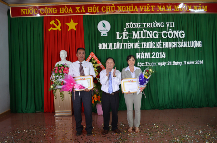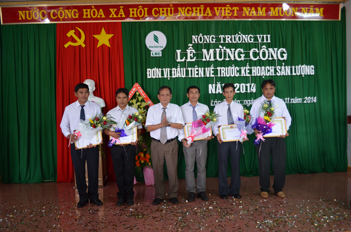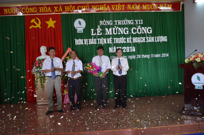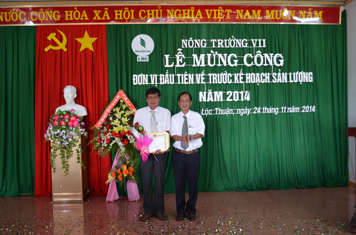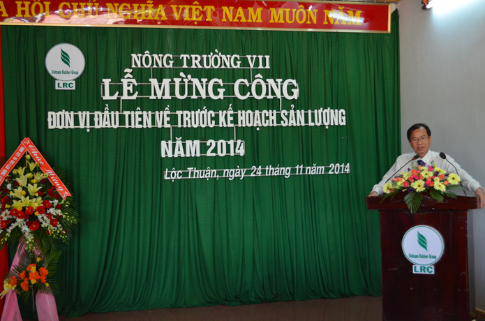 Ông Nguyễn Văn Tân - Phó TGĐ Tập đoàn công nghiệp cao su Việt Nam phát biểu chúc mừng và nhấn mạnh “Nông trường VII là đơn vị đầu tiên về trước kế hoạch sớm nhất công ty. Tôi mong rằng các đơn vị tiếp theo cũng như Công ty TNHH MTV cao su Lộc Ninh sẽ không những hoàn thành mà vượt mức kế hoạch là tiền đề và hết sức có ý nghĩa để hạ giá thành sản phẩm nhằm tăng sản lượng, tăng tiền lương thu nhập cho CNLĐ trong khi giá bán đang xuống thấp như hiện nay; Đồng thời tiếp tục giữ vững trong Top Câu lạc bộ 2 tấn của Ngành”