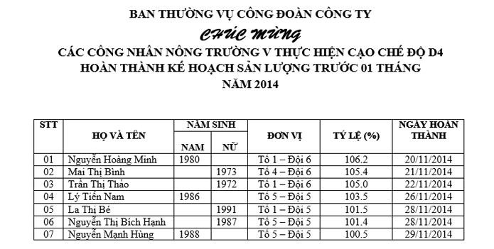 CHÚC MỪNG CÔNG NHÂN NÔNG TRƯỜNG V HOÀN THÀNH KẾ HOẠCH NĂM 2014