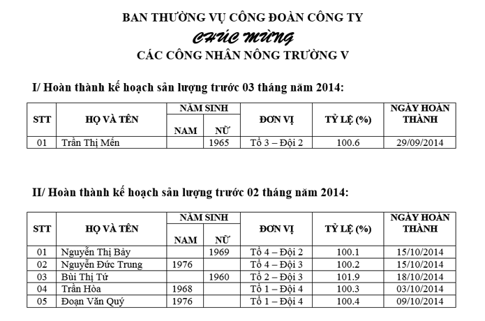 BAN THƯỜNG VỤ CÔNG ĐOÀN CÔNG TY CHÚC MỪNG CÁC CÔNG NHÂN NÔNG TRƯỜNG V