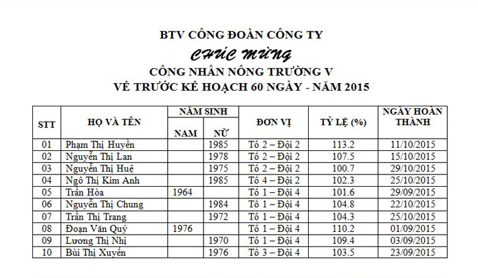 BTV CÔNG ĐOÀN CÔNG TY CHÚC MỪNG CÔNG NHÂN NÔNG TRƯỜNG V VỀ TRƯỚC KẾ HOẠCH 60 NGÀY - NĂM 2015
