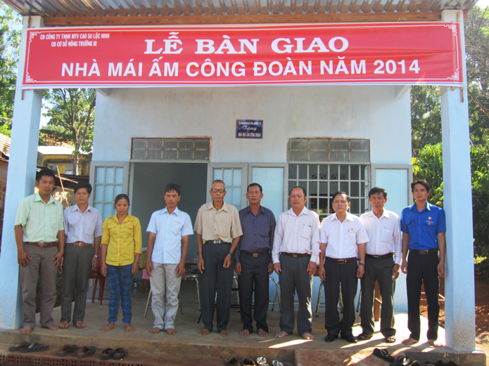 Ngày 08/12/2014 Nông trường III đã tổ chức lễ bàn giao nhà “Mái ấm công đoàn” cho gia đình Anh Nguyễn Xuân Nguồn – thuộc Tổ chăn nuôi – Nông trường III. Là công nhân chăn nuôi công tác nhiều năm với đơn vị. Anh luôn hoàn thành xuất sắc nhiệm vụ được giao, tuy nhiên hoàn cảnh gia đình anh lại rất khó khăn, chưa có điền kiện xây dựng nhà ở. Vì lý do đó, anh đã được Công đoàn cơ sở Nông trường III xét duyệt và hỗ trợ xây dựng nhà “ Mái ấm công đoàn” tại ấp 6 – xã Lộc Thuận, ngôi nhà có diện tích 70m2, tổng kinh phí xây dựng là 52 triệu đồng, trong đó 30 triệu đồng được trích từ nguồn quỹ “Mái ấm công đoàn” của đơn vị.