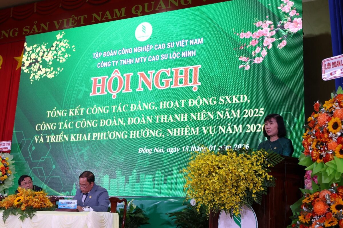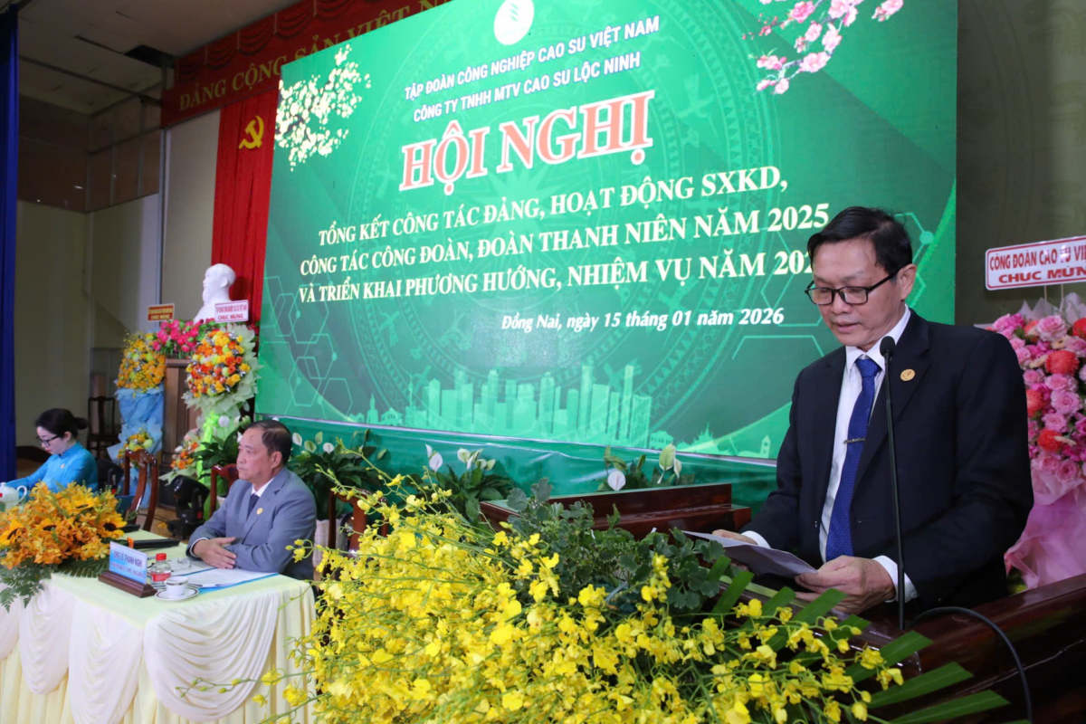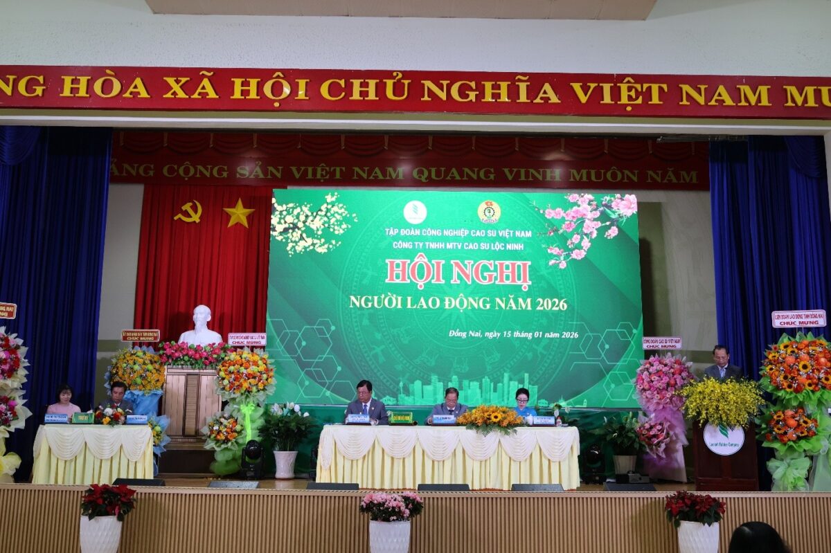 Công ty TNHH MTV Cao su Lộc Ninh tổ chức Hội nghị Người lao động năm 2026 và Hội nghị tổng kết công tác Đảng, hoạt động sản xuất kinh doanh, công tác Công đoàn và Đoàn Thanh niên năm 2025, đồng thời triển khai phương hướng, nhiệm vụ năm 2026, vào ngày 15/1.