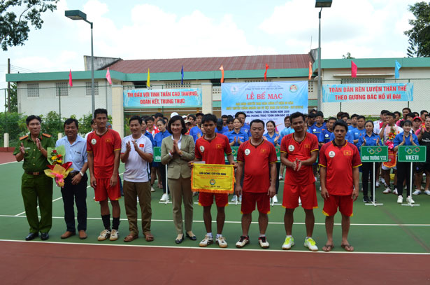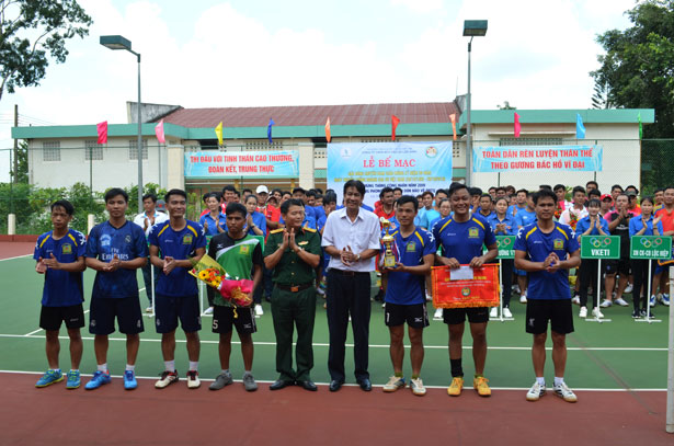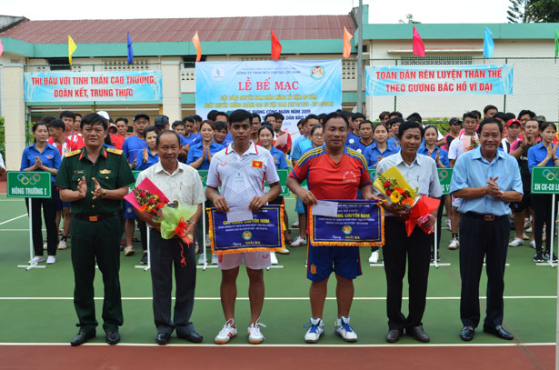 huyện Lộc Ninh (Bìa trái) cùng trao giải Ba cho đội Xí nghiệp Xây Lắp và đội Công ty VKETI.