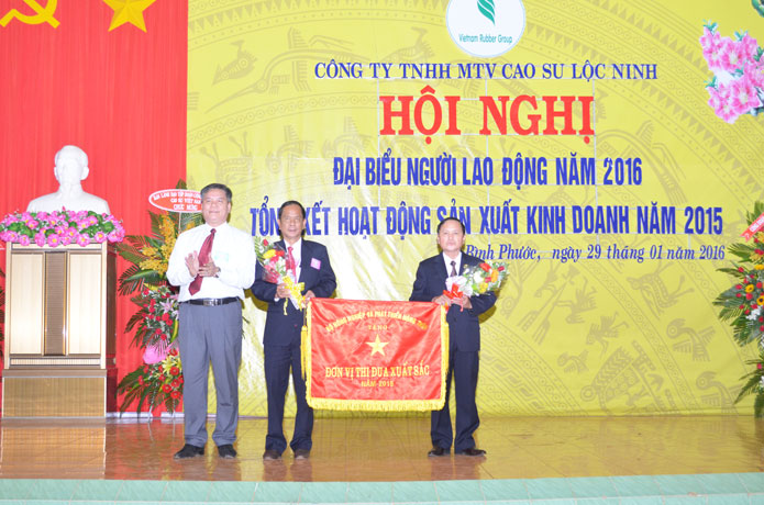 Ông Võ Sỹ Lực - Chủ tịch HĐTV VRG tặng cờ thi đua xuất sắc cho Công ty TNHH MTV Cao su Lộc Ninh