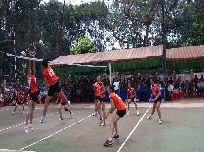 Pha tranh bóng trên lưới trong trận chung kết giữa cao su Lộc Ninh và cao su Phú Riềng