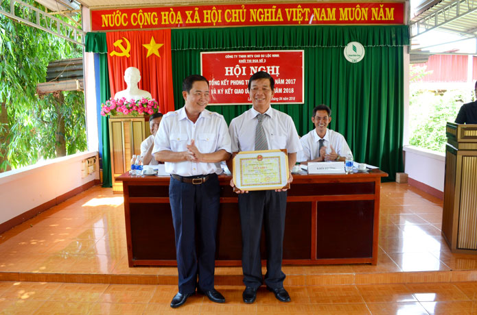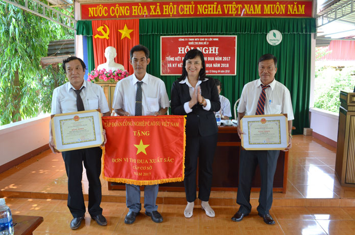 Với những thành tích xuất sắc trong hoạt động của Khối cấp cơ sở, đơn vị Xí nghiệp CKCB Lộc Hiệp được Tập đoàn Công nghiệp Cao su Việt Nam tặng Cờ Thi đua xuất sắc năm 2017; tặng Bằng khen cho 02 đơn vị Xí nghiệp Xây lắp và Bệnh viện Đa khoa. Công ty tặng giấy khen cho Cơ quan Công ty.