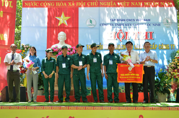 Cao su Lộc Ninh (Bìa trái) cùng trao giải Nhất đồng đội cho đơn vị xuất sắc Nông trường II.