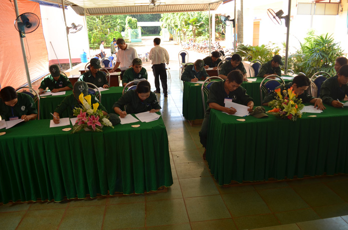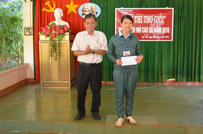 Hội thi có 13 thí sinh là công nhân khai thác được tuyển chọn từ 4 đội sản xuất về tranh tài tại trường thi (Lô 267 - giống PB255 - năm trồng 2009) thuộc vườn cây của đội 4 quản lý. Các thi sinh phải trải qua 03 nội dung thi gồm: Thi thực hành, dụng cụ và lý thuyết.