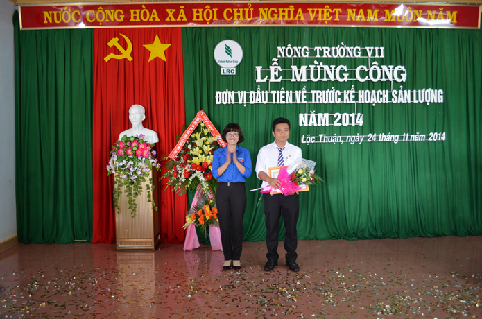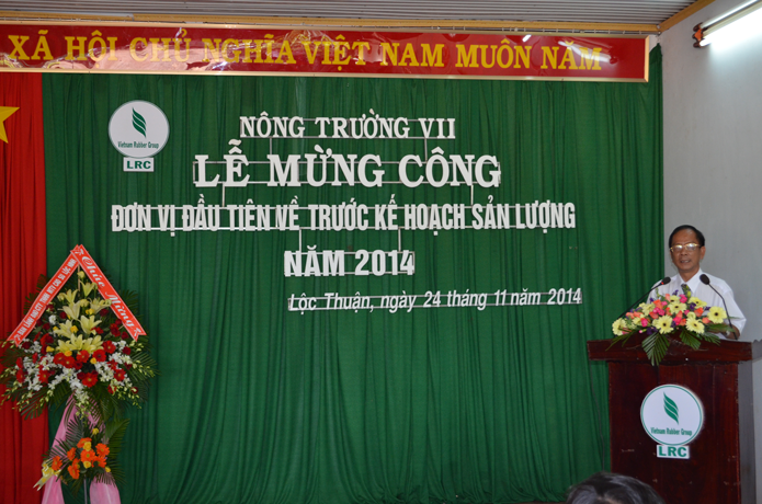 Ông Nguyễn Văn Tân - Phó TGĐ Tập đoàn công nghiệp cao su Việt Nam phát biểu chúc mừng và nhấn mạnh “Nông trường VII là đơn vị đầu tiên về trước kế hoạch sớm nhất công ty. Tôi mong rằng các đơn vị tiếp theo cũng như Công ty TNHH MTV cao su Lộc Ninh sẽ không những hoàn thành mà vượt mức kế hoạch là tiền đề và hết sức có ý nghĩa để hạ giá thành sản phẩm nhằm tăng sản lượng, tăng tiền lương thu nhập cho CNLĐ trong khi giá bán đang xuống thấp như hiện nay; Đồng thời tiếp tục giữ vững trong Top Câu lạc bộ 2 tấn của Ngành”