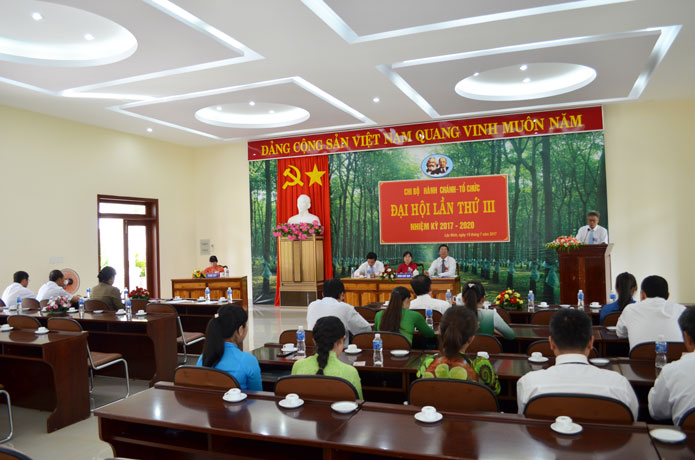 Căn cứ Điều lệ Đảng Cộng sản sản Việt Nam khóa XII. Đảng ủy Công ty đã có Công văn số 78-CV/ĐU, ngày 12/6/2017 của Đảng ủy Công ty TNHH MTV Cao su Lộc Ninh về việc tổ chức Đại hội chi bộ trực thuộc Đảng bộ cơ sở. Từ ngày 10/7/2017 đến 04/ 8 /2017, có 42/42 các chi bộ trực thuộc Đảng bộ cơ sở đã tổ chức thành công Đại hội nhiệm kỳ 2017 - 2020. Đây là đợt sinh hoạt chính trị sâu rộng, có ý nghĩa đặc biệt quan trọng đối với Đảng viên, qua đó tổng kết, đánh giá tình hình lãnh đạo thực hiện Nghị quyết chi bộ nhiệm kỳ 2015-2017 và xây dựng mục tiêu, phương hướng nhiệm kỳ 2017-2020, bầu chi ủy và chức danh chủ chốt của các chi bộ đảm bảo đủ đức, đủ tài hoàn thành nhiệm vụ trong nhiệm kỳ mới.